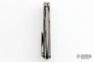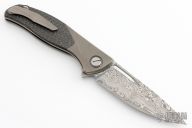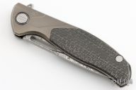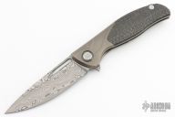 This Custom Division F3 Flipper from Shirogorov Knives has a Vinland Damasteel blade with notched flipper. Handle has titanium bolsters, silver lighting strike carbon fiber scales, bead blasted titanium liners, bead blasted titanium tip up clip and zirconium backspacer. Recessed lanyard bail. Dead center blade seating, excellent detent and lockup. Original box and COA. Excellent condition. Roller Bearing System.
