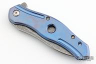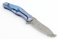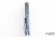 This Mini Exo flipper is from Gerry McGinnis' new Pro Line series. Features a acid tumbled sheepsfoot style blade with flipper and notched thumbrest. The handle has a stonewashed/anodized titanium frame with matching tip up clip and black G-10 backspacer. Great detent, lockup and blade seating. Comes with a zippered case. Has some scuffs/scratches, otherwise good condition.