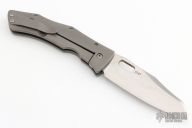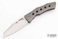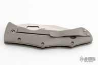 This Ed Cope Design R33 by Tom Mayo has a bead blasted titanium frame with drilled hole accents, and standoffs. The blade is hand rub satin finished blade with thumbhole. Has bead blasted tip up clip. Nice detent, lockup and blade seating. Excellent condition. Comes with a velcro case.