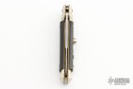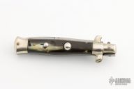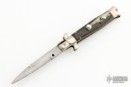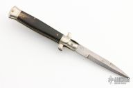 This vintage picklock features a bayonet ground blade with false top edge. The handle has nickel silver bolsters, buffalo horn scales, D-stamped brass liners, steel backspacer. Has safety. Has blade play.  There are small chips in the scales.  Has scratches and patina, otherwise okay condition.