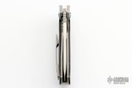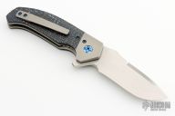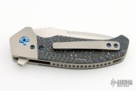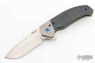 This Diesel Flipper by Enrique Pena features a hand rub satin finished drop point blade with swedge, notched thumb ramp and flipper. The handle has titanium bolsters and silver/blue lightning strike carbon fiber scales over bead blasted titanium liners and notched/blasted titanium back spacers. Bead blasted titanium pocket clip is positioned for right hand, tip up carry.  Includes a padded zippered case. Has a few light scuffs, otherwise excellent condition.