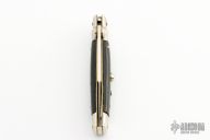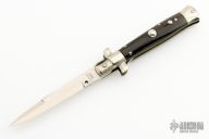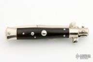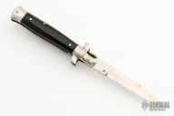 This vintage picklock features a bayonet ground blade with false top edge. The handle has nickel silver bolsters, buffalo horn scales, brass liners, steel backspacer. Has safety.  Made in Italy.  Has scuffs and scratches otherwise the knife is in good condition.