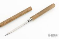 This Not Quite A Pen Knife by Crawford Knives features a mirror polished triangle blade with false top edges. The knife is set in wood. Excellent condition.
