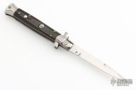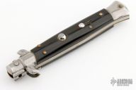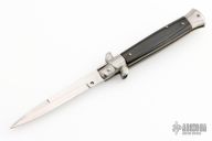 This is a classic Italian stiletto with steel fittings and buffalo horn scales. Left-handed button. Red Dot model. Only 1 of 6 made with the buffalo horn handle.  Very quick action. Sharpened on one edge only. Swivel bolster release. Excellent condition; light scratching on blade and bolsters.