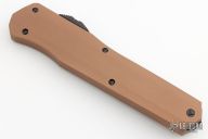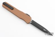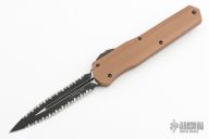 This Cypher OTF is a collaboration between Anthony Marfione and DC Monroe. It features a black double-edged blade with fully serrated edges. The handle has a tan aluminum handle with black hardware, and a titanium tip down clip and a titanium insert at the butt. Comes with original box and papers. Excellent condition.  S/N 2584.  Dated 07/2018.
