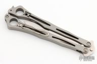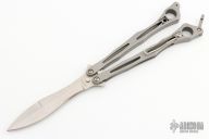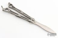 This Spyderfly Balisong by Spyderco features a satin finished spear point blade with a false top edge. The handles are bead blasted stainless steel with a tip up clip (4-way reversible). Comes with spyderco zipper case and papers. Has a couple light scuffs, otherwise excellent condition.