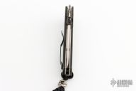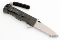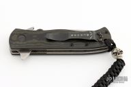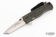 This CQC-7 from Emerson Knives features a two-tone chisel ground tanto style blade with stonewashed flats and satin grinds. The blade has a swedge, knurled thumb disc, wave features and flipper. The handle has a black/green richlite scales over titanium liners and black barrel spacers. Black tip up steel clip and lanyard hole in pommel. Comes with an Emerson Skull bead by Schmuckatelli. Great blade seating, detent and lock up. Has a few scuffs, otherwise excellent condition.