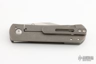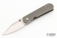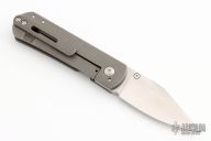This Min Pin by Ray Laconico features a satin finished blade with single thumbstud. The handle is tumbled titanium with a titanium tip up clip and carbon fiber backspacer, lanyard hole at the butt. Nice detent, lockup and blade seating. Excellent condition. Comes with a zippered case.