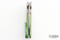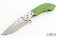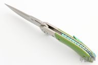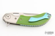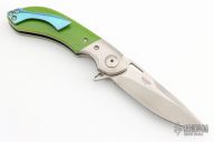 This custom Mike Vagnino designed Compact Wayfarer flipper features a two-tone blade with notched thumbrest and hollow flipper. The handle has titanium bolsters, green C-tek scales, jeweled titanium liners, anodized and fileworked titanium backspacer, anodized titanium tip up clip. Nice blade seating, detent and lockup. Comes with a zippered case. WC226 inside backspacer. Has some scratches, otherwise good condition.