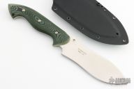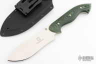 This Jerry Hossom Designed Woodlander from Spyderco features a satin finish drop point, recurve blade with notched thumb ramp, .195" blade stock and 1.968" blade depth, full tang construction. The handle has green linen micarta scales with a lanyard hole in pommel. Includes kydex sheath with Tek-Lok. Has a few light scratches, otherwise excellent condition.