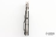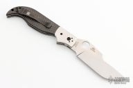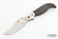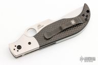 This Navaja by Spyderco was designed by Ed Schempp. It features a satin finished blade with notched thumb and index rests, thumbhole opening. The handle has satin stainless steel bolsters, carbon fiber scales, stainless liners and backspacer, and a black tip up stainless steel clip. Nice detent, lockup and blade seating. Comes with original box and papers. Has some light scuffs and scratches, otherwise excellent condition.