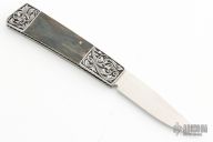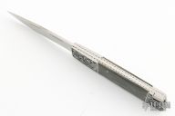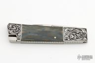 This rear lock by Frank Centofante features a hand rub satin finished blade with nail nick. The handle has engraved and dovetailed stainless steel bolsters and butt, mammoth ivory scales, fileworked stainless steel liners and a stainless steel backspacer. Nice lockup and blade seating. Comes with zippered case. Excellent condition.