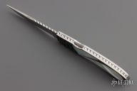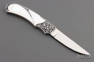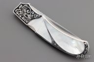 This interframe lockback by Harvey Otis McBurnette features a hand rub satin finished blade with nail nick and a fileworked spine. The handle has an engraved stainless steel frame with mother of pearl inlays, fileworked stainless steel backspacer. Comes with a leather case. Excellent condition.