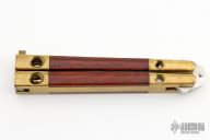 This Manilla Folder Balisong from Taylor/Seto features a satin finished spear point blade with a sharpened top edge. The handle has an integral brass construction with rosewood inlays. T latch on pommel. Has a couple light scratches, otherwise good condition. Comes with original box.