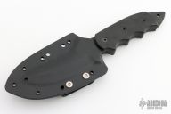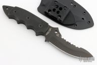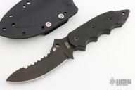 This Pygmy Warrior from Spyderco features a black coated upswept blade with sawteeth on spine. .168" blade stock and 1.52" blade depth. The handle is comprised of black G10 scales over full tang construction. Exposed tang pommel with lanyard hole. Includes kydex sheath. Has a few light scuffs, otherwise excellent condition.