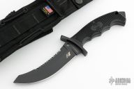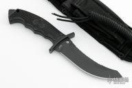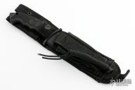 The Warrior fixed blade is one of the world's most intriguing combat knives. Based largely on the groundbreaking research of close-combat icon Michael Echanis, the original Warrior was a radical design intended primarily for use with reverse-grip tactics inspired by the Korean martial art of HwaRangDo. Produced in limited quantities by the late Al Mar and later resurrected by the martial artist Bob Taylor and Echanis contemporary Randy Wanner, it is one of the most coveted combat knives ever made. The Spyderco Warrior faithfully retains all the salient features of the original, while adding a number of performance enhancements. Its revitalization happened at the request of our Israeli customer, Guy Rafaeli. Ground from rust-free austenitic H-1 steel, it possesses the same differential hardness properties of a clay-tempered Samurai sword, giving it extreme cutting power and shock resistance. Its full-tang construction and textured handle scales provide a superior grip and edge orientation, maximizing the knife's effectiveness when employed with its signature tactics. The sheath is a black ballistic nylon snap-closed sheath with Molle-vest attachment capability. Comes with nylon sheath. Has some light scuffs, otherwise great condition.