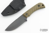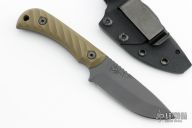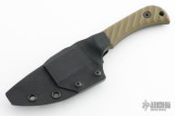 This Cav Jr by Half Face Blades features a gray coated blade with a notched thumbrest, .152" blade stock, 1.250" blade depth, full tang construction.  The handle has green G-10 scales.  Comes with a kydex sheath with clip. Has a few light scuffs, otherwise excellent condition.