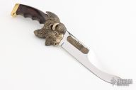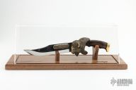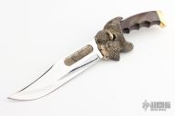 This Buffalo Bowie by Kershaw is #3907 of 5000. It features a mirror polished clip point blade, .173" blade stock and 1.503" blade depth, hidden tang construction. The handle has a bronze cast buffalo head guard, brass butt, and dymondwood grip. Comes with a wooden display stand. Excellent condition.