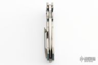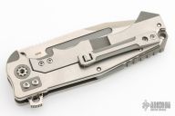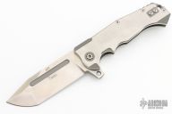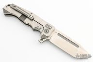 This ADV Tanto framelock flipper has a satin finished blade with swedge, fullers, notched thumbrest and flipper. Handle has a two-tone titanium frame, titanium backspacer, and tip up clip with roller, anodized hardware. Rides on bearings, nice smooth action, detent, lockup and blade seating. Comes with nylon zippered case. Excellent condition.