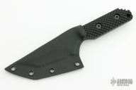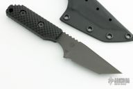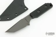 This knife by Strider Knives features a black coated tanto style blade with notched thumbrest, .132" blade stock and 1.231" blade depth, full tang construction. The handle has a black G-10 scales with gunner grip. Lanyard hole in pommel. Includes kydex sheath. Excellent Condition.