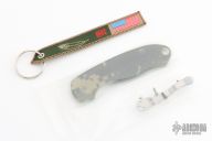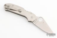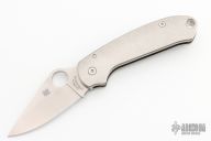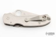 This Para 3 by Spyderco features a tumble finished clip point blade with thumb hole and notched thumbrest. S45VN Blade Steel. The handle is comprised of an RGT Full Ti frame over nested steel liner and stand-offs. Tip up Lynch clip. Includes original box, scales, clip, lynch keychain, and paperwork. Excellent condition.