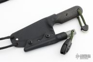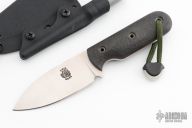 "The PSK (Practical Survival Knife) series of knives were designed to be "no frills". These are purpose driven tools designed specifically for the backcountry...not the living room. That's why they include a misch metal fire starter (BSM-Back Country Survival Match) on the sheath and a striker ground into the blades spine. The handle was designed to be as ergonomic as possible without having a radical appearance. They are contoured in such a way that prevents most hot spots from occurring. The PSK-5 is a 3" spear point. It features a full flat ground satin finished blade, ergonomic handle and BSM/striker. The blade steel is Crucible 1/8" CPM S30V (59-60 HRC)." This knife features a satin finished blade with a notched thumbrest and a full tang construction. .126" Blade Depth. 1.124" Blade Depth. The handle features a carbon fiber handle over red liners. Includes fire starter and kydex sheath. Excellent Condition.
