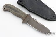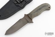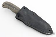 As the name implies, the WK Utility Knife Crusher is made for a variety of cutting chores. The wide blade is strong and the aggressive serration along the spine provides additional cutting/sawing options without sacrificing any of the cutting edge. The double “cross guard” makes heavy work safer for the user. We have added a Crusher Pommel to the back of the Knife to act as a glass breaker or pointed striker. The lined Boltaron® sheath with a 1/8” Black Laminate welt is designed for optimal carry.