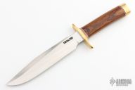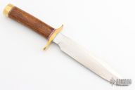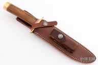 The Model 1 was made famous by Allied combat troops in World War II and has since been widely used in all theaters of war. .202" blade stock and 1.281" blade depth, Hidden tang construction. It has a satin finish blade with sharpened top edge. Brass guard, desert ironwood grip with red/white/blue spacers, and a brass butt cap. Includes brown leather sheath and original paper wrapping. Excellent condition.