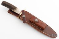 This Model 2-7 by Randall Made knives features a satin finished double edged blade, .212" blade thickness and 1.296" blade depth, hidden tang construction. The Model 2 is a heavily made dagger or dirk. Brass guard and stag grip with red/white/blue spacers. Comes with a brown leather sheath and original paper wrapping. Excellent condition.