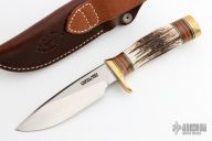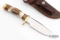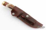 The Model 25-5 by Randall Made Knives is a drop point hunter similar to Model 11, but handle construction is reminiscent of 1930′s design. Excellent skinning, outdoors knife. This knife has a carbon steel blade with notched thumbrest, .200" blade stock and 1.302" blade depth, hidden tang construction. The handle brass guard and pommel, stag grip with stacked leather, black and brass spacers. Comes with brown leather sheath and original paper wrapping. Excellent condition.