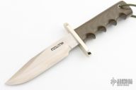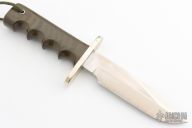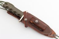 This Model 15 Airman by Randall Made Knives features a clip point blade with a sharpened top edge, .218" blade stock, 1.303" blade depth, full tang construction. The handle has green linen micarta handle with finger grips and a nickel silver guard. The Model 15 is designed especially for heavy-duty use and to be as nearly indestructible as possible. Comes with a brown leather sheath and original paper wrapping. Excellent condition.