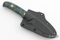 This K-14 by Dozier knives has a satin finished drop point blade with full tang construction. .128" blade depth and .839" blade stock. Has dyed and stabilized maple burl scales with brass pins and lanyard hole. Comes with a kydex sheath. Excellent condition.