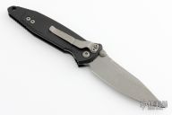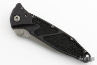 This Socom Elite manual linerlock folder by Microtech Knives has an apocalyptic finish blade with notched thumbrest and dual thumbstuds. Has a black aluminum handle with non-slip inlays, tip down blasted stainless steel clip. Serial number 13202 and dated 04/2023. Comes with original box and papers. Excellent condition.