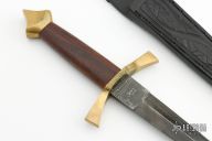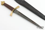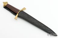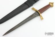 This dagger by Jaeger Knives features a Damascus blade with unsharpened edges, .235" blade stock and 1.235" blade depth, hidden tang construction. The handle has a brass guard and butt with a cocobolo grip. Comes with a hand tooled black leather sheath. Has a couple light scratches, otherwise excellent  condition.