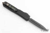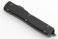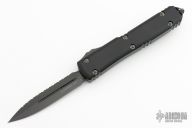 This Ultratech OTF automatic features a D/E black blade with full serrations. The handled features a black aluminum frame with a bead blasted stainless steel clip. Glass breaker. Serial number 425 and dated 03/2023. Excellent condition.