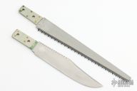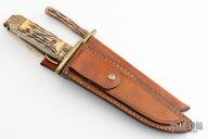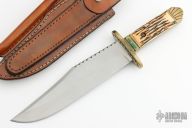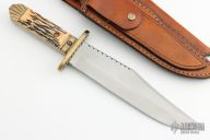 This bowie by Big Ed Douglas features a satin finished blade with false top edge and fileworked spine, .180" blade stock and 1.953" blade depth, hidden/frame tang construction. The handle has a brass guard and bolsters, jigged bone scales with brass liners. Comes with a matching sharpening steel. Comes with a brown leather that holds the shapening steel and two extra blades that can be put into the handle by removing the two screws. One is a smaller blade and one is a saw blade. Has some light scratches and patina, otherwise good condition.