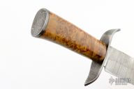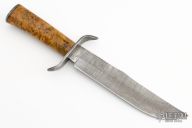This Bowie by Keith Bagley has a Damascus blade with a nice temper line, .146" blade stock and 1.682" blade depth, hidden tang construction. The handle has a Damascus guard and butt with a maple burl wood grip. Excellent condition.