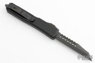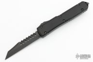 This Ultratech Warhound by Microtech Knives features a black stonewash DLC blade with notched thumbrest and fullers, false top edge. The handle has a black aluminum frame with tip down black stainless steel clip, black DLC hardware, black titanium thumbslide. Comes with original box and papers. Dated 07/2022 and s/n 393. Excellent condition.