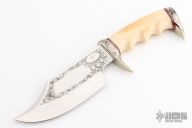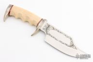 This knife features a mirror polished clip point blade with a hidden tang construction.  .262" Blade Stock.  2.536" Blade Depth.  The handle has a nickel silver guard and butt cap with a walrus tuck grip. There is engraving on the blade flats and guard.  There is a little separation between the grip and the guard otherwise the knife is in Excellent Condition.