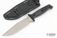 Shane Sibert designed this heavy-duty fixed blade for Benchmade. The Arvensis is a big knife that has a "light hand feel". The nearly 6.5" blade has a pronounced clip point profile and includes a large choil for choking up on. Contoured black G-10 scales are fastened to the full-tang 154CM steel blade with tube pins and straddle the fine line of comfortable grip. The Arvensis includes a Boltaron sheath with an innovative attachment feature.