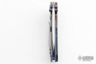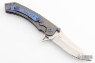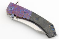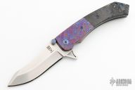 This Azrael  features a hand rub satin finish blade with dual thumbstuds and notched thumb rest. The handle has timascus bolster and carbon fiber front scale with tumbled titanium rear and anodized pocket clip for tip up carry. Strong lock up, flipping does not require any wrist movement. Has some scuffs and scratches throughout, good condition otherwise.