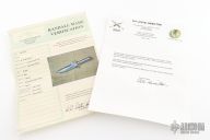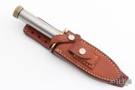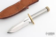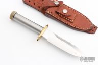 The Model 18 Mini by Randall Made Knives, features a satin finished blade with sawteeth, brass fittings, and stainless steel handle (no knurling). Approximately 300 made. .122" Blade Stock .867" Blade Depth. Includes screw on butt cap for survival kit storage. Comes with original leather sheath and a zippered case. Sheath is missing the stone. Has a few light scratches, otherwise excellent condition. This one is #143. Comes with COA verifying the s/n and its authenticity.