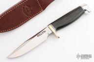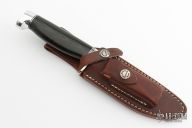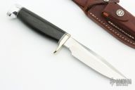 This Model 5-5 by Randall Made Knives features a satin finished clip point blade with a false top edge and a notched thumbrest, .221" blade stock and 1.069" blade depth hidden tang construction. The handle has a nickel silver guard, black linen micarta grip and a duralumin butt cap. Comes with a brown leather sheath and a Randall zippered case. Excellent Condition.