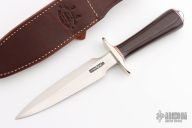 This Model 2-6 Fighting Stiletto from Randall Made Knives has a double edged blade with .197" blade stock and 1.208" blade depth, hidden tang construction. The handle has a nickel silver guard and duralumin butt cap, maroon linen micarta grip and red/duralumin spacers. Comes with a brown leather sheath and Randall zippered case. Excellent condition.