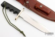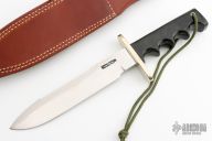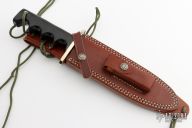 The Model 14-7.5 by Randall Made Knives features satin finished blade with sawteeth, .211" blade stock and 1.349" blade depth, full tang construction. The handle has a double nickel silver guard, and black linen micarta grip with a lanyard hole. Comes with brown leather sheath and a Randall zippered case. Excellent condition.
