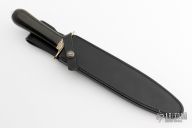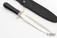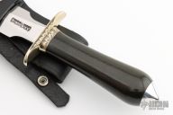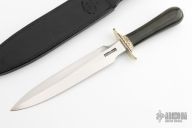 The Model 2-8 by Randall Made Knives is a heavily made dagger or dirk. Engraved nickel silver guard, black linen micarta grip, duralumin coolie butt cap, black spacers. Double-edged satin finished blade, .184" blade stock and 1.303" blade depth, hidden tang construction. Comes with a black leather sheath and a Randall zippered case. Excellent condition. Engraving done by Simon M Lytton
