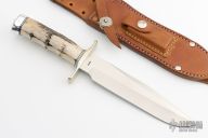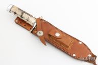 This Fighter by Martin Knives features a satin finished blade with sharpened top edge, .216" blade stock and 1.462" blade depth, hidden tang construction. The handle has a nickel silver guard, stag grip with aluminum/black spacers and an aluminum butt. Comes with brown leather sheath. #07 under choil and #2 on choil. Excellent condition. Comes with a zippered case.