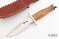 This Combat Companion by Randall Made Knives features a satin finished blade with sharpened top edge, .196" blade stock and 1.179" blade depth, hidden tang construction. The handle is comprised of a nickel silver double guard and duralumin butt, black/duralumin spacers, African Olivewood grip. Excellent condition. Includes a brown leather sheath and a Randall zippered case.