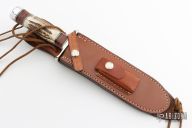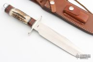 This Fighter by Martin Knives features a satin finished blade with sharpened top edge, .216" blade stock and 1.473" blade depth, hidden tang construction. The handle has a nickel silver guard, stag grip with aluminum/black spacers and an aluminum butt. Comes with brown leather sheath. #07 under choil and #3 on choil. Excellent condition. Comes with a zippered case.