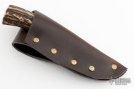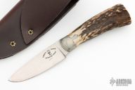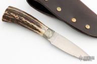 This utility by Liberty Hill Forge features a hand rub satin finished blade with fileworked spine, .110" blade stock and .960" blade depth, hidden tang construction. The handle has cast pewter bolsters and a stag grip. Coems with a brown leather sheath. Has some light scratches and patina, otherwise good condition.